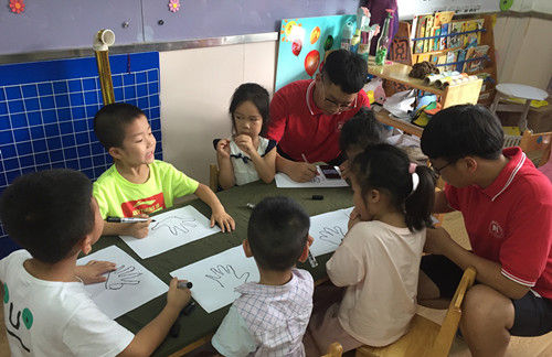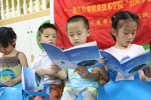 图为:给当地幼儿园小朋友普及剿劣治水知识。