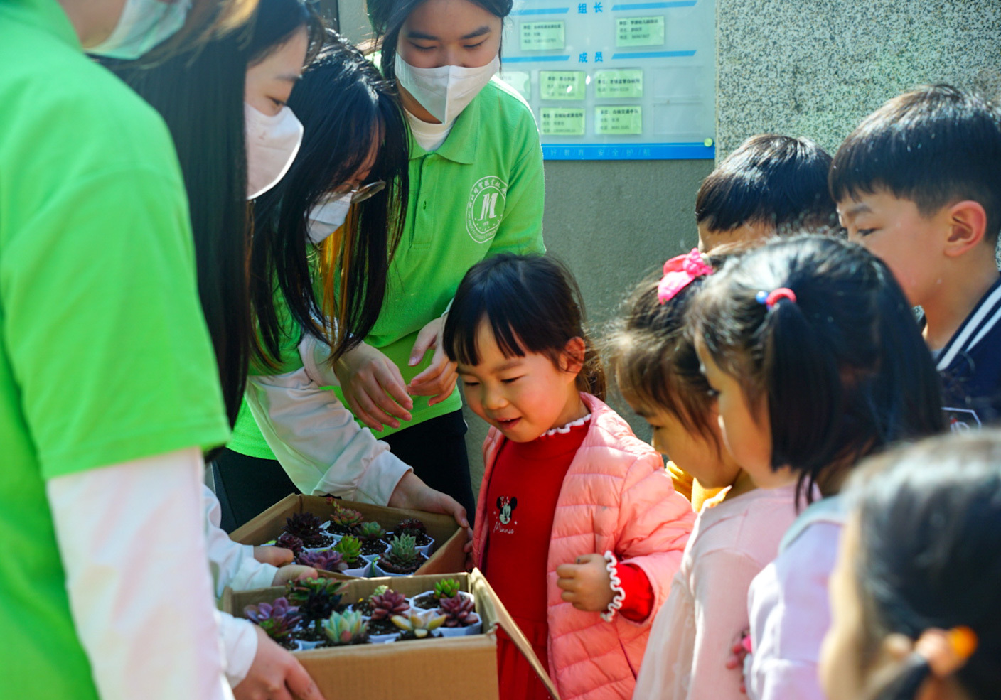 此外,会计学院的学生还走出校园,将这些贴着“绿水青山就是金山银山”“保护树木,就是保护自己”“多一份绿叶,多一份温馨”标语的盆栽送给了附近小区的居民和幼儿园的孩子,将这片生机勃勃的绿意和“爱护环境从我做起、从小做起”的理念传递下去。
