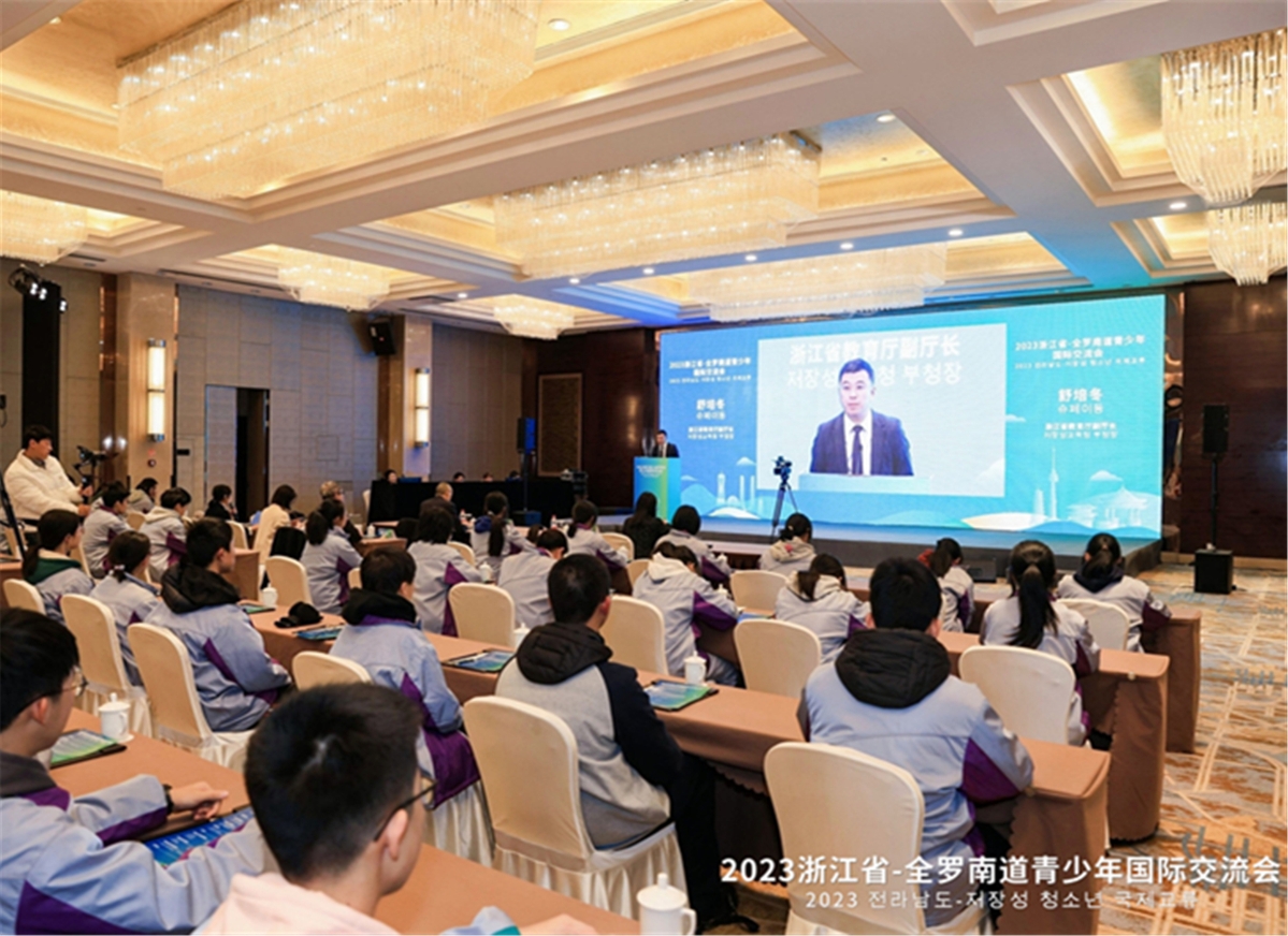 12月18日下午,浙江省与韩国全罗南道青少年国际交流会通过视频连线方式举行。活动由省教育厅、省外办、全罗南道国际协力局主办。省教育厅副厅长舒培冬、省外办二级巡视员施华忠、全罗南道希望人才培育课课长张光烈、全罗南道青少年未来财团院长梁美兰等出席活动并致辞。