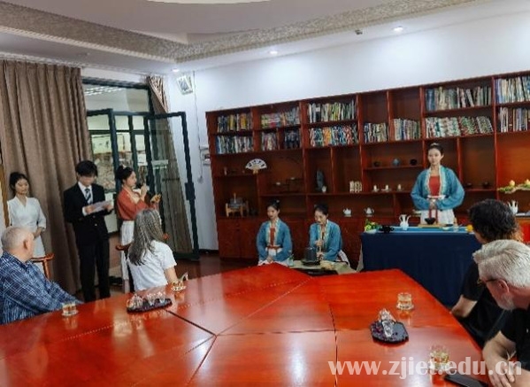 为了让美国师生充分了解中华文化,学校还举行了中美师生“非遗宋韵”体验活动。经贸师生身着传统服饰,向来访嘉宾展示宋代点茶技艺和传统花茶文化。在非遗制扇体验环节,美方师生在中方教师的指导下,亲身体验了传统非遗工艺竹篾制扇的全程操作。Whitman同学表示,通过这些有趣的沉浸式体验活动,让他对中国传统文化有了更深刻的认知,他要将这些作品带到美国,与美国同学们分享这精美的传统工艺。在杭期间,美方师生一行还参访了杭州南宋德寿宫遗址博物馆、杭州博物馆等。